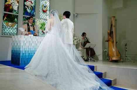 当式場の挙式には愛犬も参加することができるため、リングドッグをしたいと希望していたおふたりの決め手となりました。また、ブルーのバージンロードは、青が好きなご新郎の好みでもあったそう。 ご新婦の選んだウェディングドレスは、クラシカルでナチュラルなAラインでありながら、派手すぎず、キラキラとした素材で華やかな印象を与え、挙式会場に美しく映えていらっしゃいました。