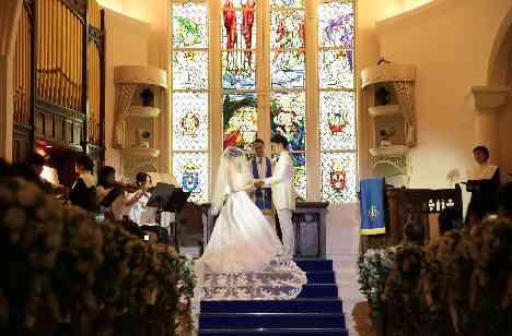 「ドレスのトレーンの刺繍が綺麗に見える青いバージンロードもとても気に入っています。取り扱っているウェディングドレスは刺繍が素敵なものが沢山あり、こだわりのドレスを着用することができました」とお言葉の通り、ドレスがとってもお似合い ♡ 結婚証明書に記した“喜びも悲しみも共に”という言葉を胸に誓いをされたそう。 スムーズに挙式を執り行えるよう、自宅でベールアップなどの練習もされたそう。