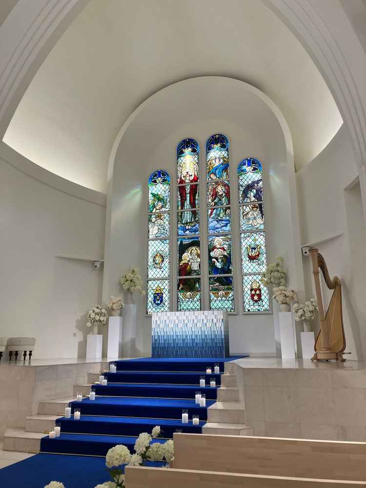 チャペルが特によかった。真っ白な壁と青いバージンロード、ステンドグラスで、ウエディングドレスを来たらもっと素敵になるだろうと想像がつく空間だった。