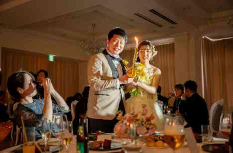 試着を重ねて選んだカラードレス。階段からの入場でしっかりと全身をご披露いただきました。受付で行った新婦のカラードレス当ての投票も行っていたこともあり、お色直しでお2人が登場されると会場内のゲストからは歓声が上がるシーンにもなりました。カラードレスの色当てクイズに正解したゲストには新郎新婦から素敵なプレゼントもご用意いただきました。