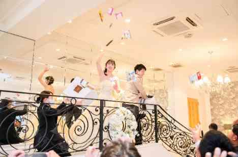 新郎新婦様が退場し、披露宴の余韻が冷めやらぬ間にゲストを会場の専用リビングへとご案内。新郎新婦から最後のサプライズは、名古屋の定番演出【お菓子まき】。箱いっぱいに用意されたお菓子を階段からゲストへお届けする人気演出です。一つでも多くのお菓子をキャッチしようとゲストも大盛り上がりでした。最後までゲストを楽しませようとしてくれたお2人でした。