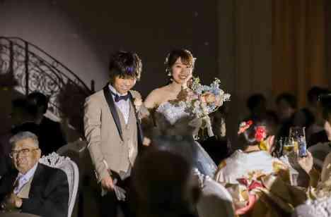 「星ヶ丘」という地で結婚式を挙げることから再入場シーンでは会場内の星空演出【Under The Starry Sky】を取り入れたお2人。会場内に広がる星空の中から登場したお2人はそれまでとはガラッと印象を変えたお姿に。事前にどんな色のドレスにお着替えをされるか予想をされていたゲストからは驚きの声を上げる方も見られました。