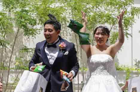 フラワーシャワー後はゲストへ最初のおもてなしとして用意した『お菓子まき』。大量に用意したお菓子をゲストへプレゼント!披露宴が始まる前から大盛り上がりのウェルカムパーティーとなりました。お菓子まきの後はゆっくりドリンクやアペタイザーと一緒にお写真タイムをお楽しみいただきました。ゲストも挙式の姿そのままのお2人とのお写真撮影に大満足のご様子でした。