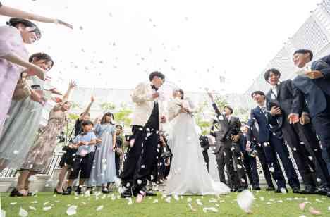 一生の記録に残る映像や写真映えもこだわってシーンを作り上げました。ゲストがただ並んで行うフラワーシャワーではなく、ゲスト全員に囲まれ一斉に投げていただく事が幸せに包まれたお2人を表現!広がる空の下で行われたフラワーシャワーは新郎新婦を中心に弾ける笑顔が印象的。空と緑に囲まれたアートグレイスだから叶えることができる写真映えもばっちりなワンカットになりました。