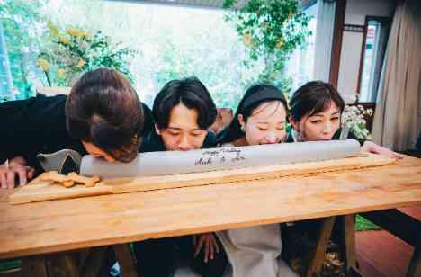 緊張も和らぎ、リラックスした雰囲気ではじまったパーティ。友人からのスピーチや写真撮影を楽しんだ後は、披露宴のメインイベントケーキの登場です。ながーーいロールケーキは、ふたりのペットをイメージして完成したデザイン。サプライズで両家の母を呼び、4人仲良くケーキをパクっ!大勢のゲストに囲まれ、大盛り上がりの時間になりました。