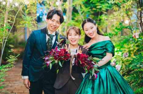 新婦中座後は、新郎が熱望したイベント「バナナの早食い競争」を開催。一生懸命バナナをほおばる姿にゲストも大爆笑でした。そしてお色直しは、がらっと雰囲気を変えてグリーンのドレスへ。黒髪のロングヘアと大人っぽいグリーンは相性ばっちり。BGMに合わせて新郎新婦が歌いながら入場しました♪後半も格付けクイズで盛り上がり、笑いと涙の時間を過ごしました。