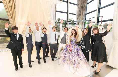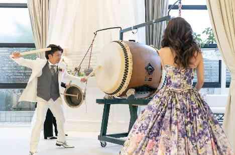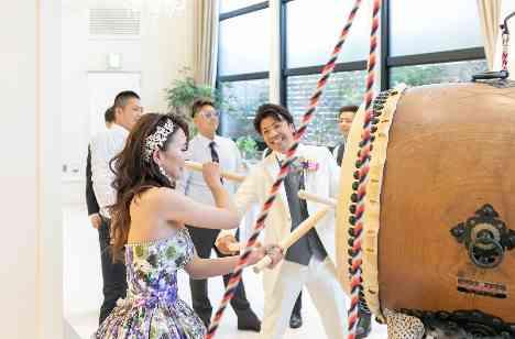 ninagawa mikaのカラードレスは白亜の会場に映えてとっても素敵!らせん階段からの入場も華やかです。さらに、お色直し入場後の会場に花を添えたのは、なんとテラスに大太鼓が登場いたしました!新郎様だけではなく、お仲間や新婦様からも大太鼓のご披露。まさに「特別」な一日となり会場にも一体感がでましたね。