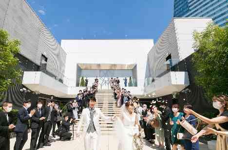 無事にお天気にも恵まれて、雲ひとつない青空のもとでフラワーシャワーで祝福いただきました。 憧れの大階段でお祝いののちは、披露宴前のウェルカムパーティです。披露宴前に新郎新婦様と皆さんで過ごすことができるひとときは好評!おふたりも皆さんとの全身での集合写真撮影や語らいのお時間を楽しんでらっしゃいました。