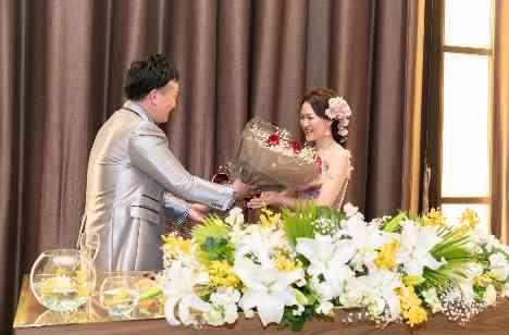 披露宴でのサプライズ、新郎様から新婦様へお花束のプレゼント。5本の赤いバラとピンクのチューリップの花束をお渡しになりました。 ”あなたに出会えた心からの喜び””誠実な愛”という想いをのせて。普段は照れてしまって伝えることの出来ない気持ちを込めて。新婦様は思わず涙でしたね。これからも末永くお幸せに!