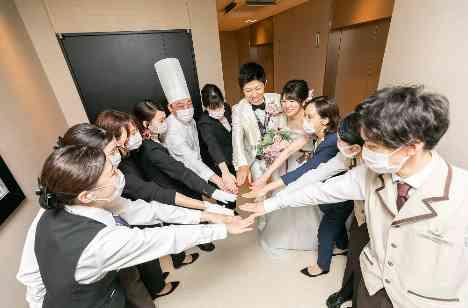 ご延期を乗り越えて、やっと迎えたハレの日。大好きなゲストの皆様に見守られとても暖かなお式となるよう、スタッフ一同精一杯お手伝いさせて頂きました。披露宴前には、お写真のようにみんなで円陣を。「今日は誰よりも楽しむぞ!」とのお気持ちを胸にご入場を。スタッフのことも愛してくださったおふたりはご披露宴入場前に円陣を組んでくださいました。