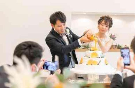 ゲストの皆さんも注目!シャッターチャンスのひとつ!おふたりの輝かしい未来を彩るようにウエディングケーキをドリップで仕上げます☆打合せではパティシエと直接相談して、オリジナルウエディングケーキを作成します。ゲストの皆さんもシャッターチャンスが増えて嬉しいですよね!会場もより一層華やかな印象となりました。
