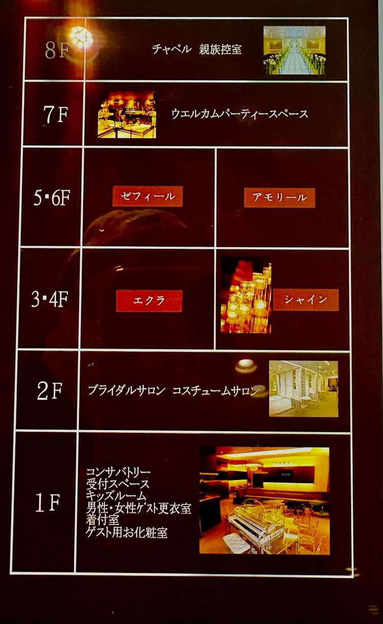 4つ会場あるので、好きな雰囲気が選べるのはいいなと思いました。でも会場によって金額は異なります。 あと、8階チャペル出てからのフラワーシャワーは、目の前に思い切りアパートが建ってて、主人が気にしてました。雨が降ったら殺風景なスペースだなぁと。 移動が多くて主人の祖母の移動の大変差を気にしてました。男性目線ではなるほどなと思いました。