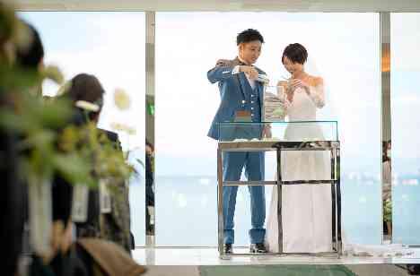 新郎入場では、新郎父からジャケットセレモニーを、新郎母からブートニアのお仕度のお手伝いをしてもらい、挙式スタート。新婦入場では、新婦母からベールダウンのお仕度を、ヴァージンロードは新婦父と歩きました。また「これからふたりはひとつの家族として生きていく」という意味を持つサンドセレモニーを。ゲストに受付時、ガラスの器に砂を入れてもらい、挙式中にふたりで砂を入れて蓋をし、完成させました。