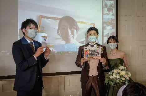 事前に直筆でメッセージを入れたプロフィールブックを、引出物やお祝い膳と共にゲストのご自宅へ発送しました。披露宴の中で、新婦のお色直しドレスの色あてクイズを色つきのマスクで行うイベントを行いました。オンライン参加のゲストにはドレス色あてクイズのマスクを一緒に送って、ご自宅からであってもイベントを楽しめるようにできました。