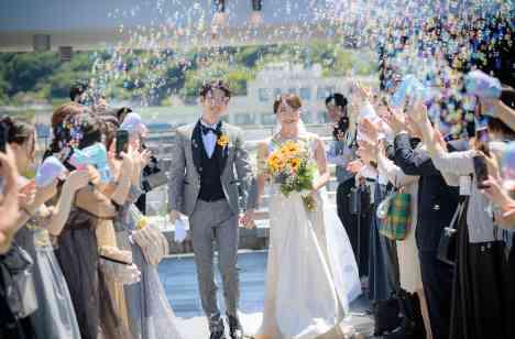 和やかなチャペルでの人前式の後は、屋上テラスでウェルカムパーティを。バブルシャワーでゲストにお迎えいただき、華やかでとても写真が映える演出になりました。披露宴会場に向かう前に、新郎新婦とゲストと触れ合い、広くどこまでも続く空と穏やかな蒼い海を眺めながら、大切な人たちだけに囲まれた特別なひとときをお過ごしいただきました。