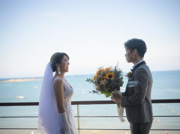 おふたりのお仕度は、ゆったりとスイートルームにて。 挙式前に初めてお互いの衣装を見せ合うファーストミートを行い、感動的な一日の始まりとなりました。会場はひまわりいっぱいに。BGMは、新婦家が幼少期よりドライブでよく流れていたというサザンの曲を中心に、純白のウェディングドレスとお色直しのオレンジのカラードレスがとても映え、夏を感じられる笑顔いっぱいの明るい結婚式となりました。