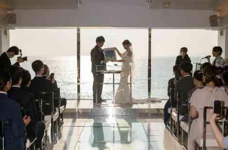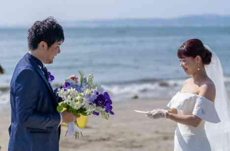 新婦入場はお母様と、ベールダウンは新婦おば様に、リングガールは、学生時代からのご友人のお子様に。 誓いの言葉では、新郎新婦それぞれのご友人よりおふたりへ問いかけをしてもらい、結婚証明書は、シーグラスにサインをし、ゲストのシーグラスと合わせたフォトフレームに入れ、誓いを立てました。 穏やかな海と空をバックに、大切なゲストの皆さま参加型の、愉しく感動的な人前式となりました。