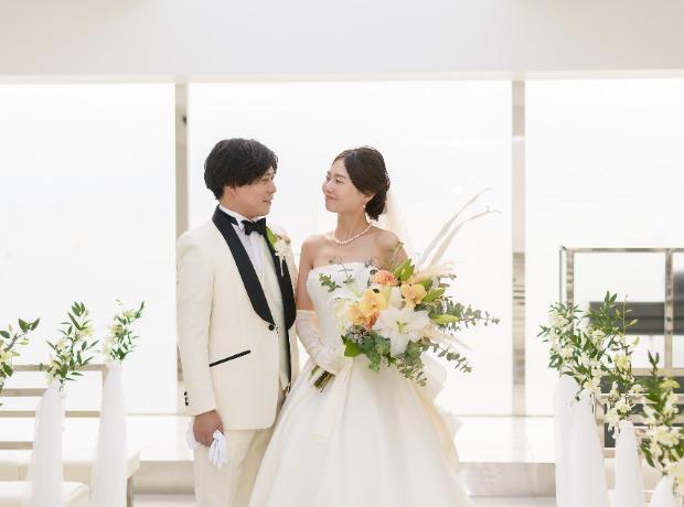 スイートルームでお仕度を整え、目の前のビーチで海と空をバックにフォト撮影を。チャペルでの撮影を行った後、キリスト教式がスタート。お母様からのベールダウン、おじい様との入場で感動的な挙式の始まり。おふたりが家族になる幸せを改めて確かめ合う心温まる時間となりました。挙式後は、屋上テラスでのウェルカムパーティ。全員参加のお菓子トスや全員での写真撮影を行い、ゲストと一緒に盛り上がりました。