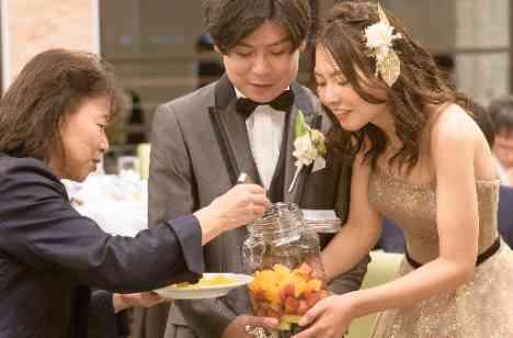 再入場はフォト撮影を行いながら、果実酒作りでテーブルラウンドを。新郎新婦が大きなガラス瓶を持ち、そこへゲストがフルーツをガラス瓶へ入れていきました。ゲストのテーブルを回り終えたら、色とりどりのフルーツが入ったガラス瓶に、新郎新婦がミント、氷砂糖、ホワイトリカーを注ぎ、完成。また、初めての共同作業ともいわれる水合わせの儀の意味もあり、全員が参加でき、会場全体が一体となった演出となりました。