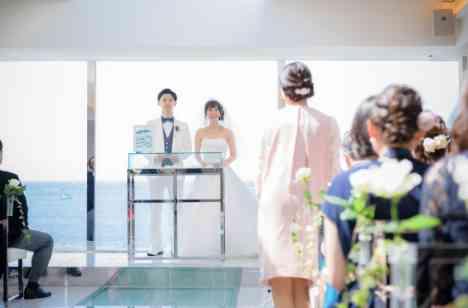 まるで海に浮かんでいるような、透明感あふれるチャペルに夢心地。 互いに考えた誓いの言葉を、それぞれの友人が新郎新婦に代わって問いかけるシーンが印象的。 「牧師さんのような口調に思わず私たちもゲストも笑ってしまいました。みなさんに協力してもらったサンドセレモニーで素敵な記念品も完成してよかったです
