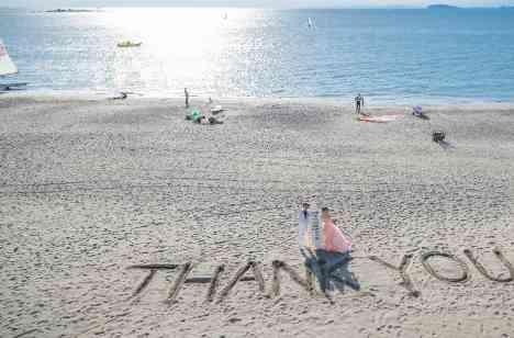 ゲストとの触れあいも大切にしたかったふたり。ホワイエでのデザートビュッフェでは、ふたり自らお皿を手渡してもてなした。また、エンディング演出がゲストの話題に。「当日の様子を収録した映像には砂浜で作業する私たちの姿も…。上映後にブラインドが開き、THANK YOUの砂文字の側で手を振るサプライズは大成功!」。