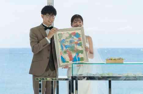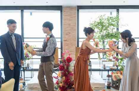 チャペルでの挙式前に、ご両家ご家族とのファミリーミートとそれぞれの家族のつながりが生まれるという意味がある、親族杯の儀を。澄み渡る蒼い空からも、家族全員で。人前式の新郎入場は、お父様が好きだったサザンの曲をバックにお母様よりジャケットセレモニーを。新婦は、お母様よりベールダウン、お父様と入場され、心温まる時間に。結婚証明書はゲストに一筆ずつ色を入れていただいたキャンパスアートにサインをしました。