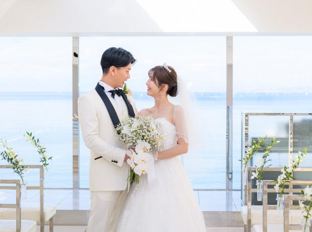 純白のドレスを着て、思い出の砂浜へ。青い海と空のもと、新郎とのファーストミートと、お両親とのファミリーミートを。おふたりもご家族も笑顔がいっぱいに、感動のひとときとなりました。 温かな光が降り注ぐチャペルでの挙式では、可愛いリングガール&ボーイの入場に、結婚証明書はゲストのフィンガースタンプを押して作られた色とりどりのウェディングツリーに、新郎新婦がスタンプを押し完成させました。