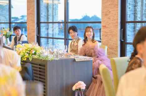 お色直しは、ご新婦さまのやわらかな雰囲気にぴったりな、ピンクパープルのやさしく可愛らしいドレスにお着換え。ご新郎さまとのセカンドミートを行った後、再入場。ゆっくり各テーブルにご挨拶にまわりながら、ゲストとのフォト撮影を行いました。新婦お父さまからのプレゼントの、ハープの演奏やゲストへのサプライズインタビューで、ゲストも参加型のアットホームで穏やかな時間となりました。