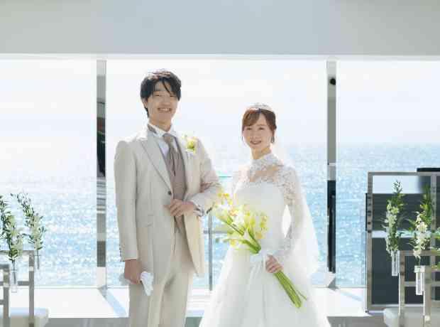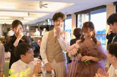 ウェディングドレスとタキシード姿のおふたりは、チャペルで親御様と初めて顔を合わせるファーストミートを行い、ジャケット・グローブセレモニー、ベールダウンで感動の入場となりました。結婚の証人は、ゲスト皆に、ボードに色とりどりのシーグラスを並べていただき、完成させました。挙式後の屋上テラスのウェルカムパーティでは、ゲストよりバブルシャワーでお迎えいただき、ゲストとの写真撮影や会話の時間を楽しまれました。