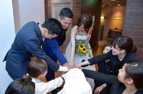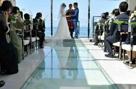 当日はお天気がよく、快晴の空と青い海に祝福されるセレモニーに。ビーチのような砂が敷き詰められたガラス張りのバージンロードも、海辺のウエディングを引き立てた。「『海の景色がすごいね』とゲストにも大好評でした。挙式後は外に出て全員で集合写真を撮り、ウェルカムパーティでゲストをおもてなししました」。