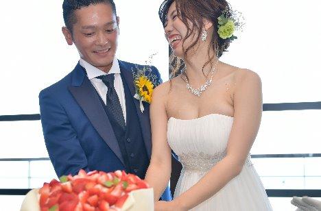 ボトルビュッフェからビールやジュースなど好みの1本を取って着席してもらい、アットホームな雰囲気で乾杯!「リラックスして楽しんでほしかったので、おしゃべり中心のパーティにしました」。海を背景にしたケーキ入刀シーンも印象的!ひまわりのブーケや会場装花など、夏を意識したコーディネートの仕上がりにも大満足。