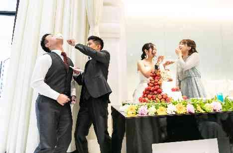 ゲスト参加型の演出を取り入れたおふたり。会場内も盛り上がった瞬間が多数ございました。 ケーキ入刀&ファーストバイト時には、おふたりがお付き合いに至った際のキューピット2名様にサプライズでサンクスバイトの演出を♪おふたりとも驚きつつも快く引き受けてくださいました。 お色直し色当てクイズの際は豪華景品を用意されたりと、会場内は楽しくかつ盛り上がったご披露宴でした。