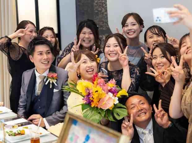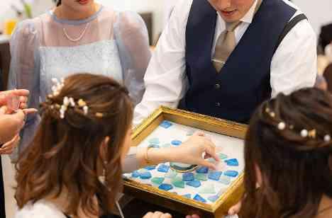 お色直し入場→ドレス色当てじゃんけん大会…と会場内のボルテージは最高潮に…♪ここからおふたりはゲストの皆様のお席に進み各卓フォトを☆ 各卓フォトの際は、初夏の結婚式をお選びいただきましたおふたりらしく『シーグラスの結婚証明書』を皆様で作成☆ 皆様のお名前入りシーグラスをはめ込んでいき、完了の際は素敵なシーグラスアートが出来上がりました!