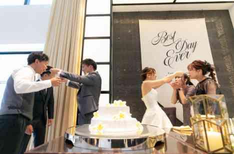 ケーキご入刀とファーストバイトがお済みになりケーキセレモニーもお開きかと思いきや…司会者よりサプライズで4名のご友人のお名前が呼ばれサンクスバイトのご案内が♪ サンクスバイトは感謝の意が込められております。 『今までありがとう』『これからもよろしく』その想いを乗せて一斉にバイト! サプライズで呼ばれたゲストはもちろん、会場内は驚きと歓声に包まれた瞬間でした!