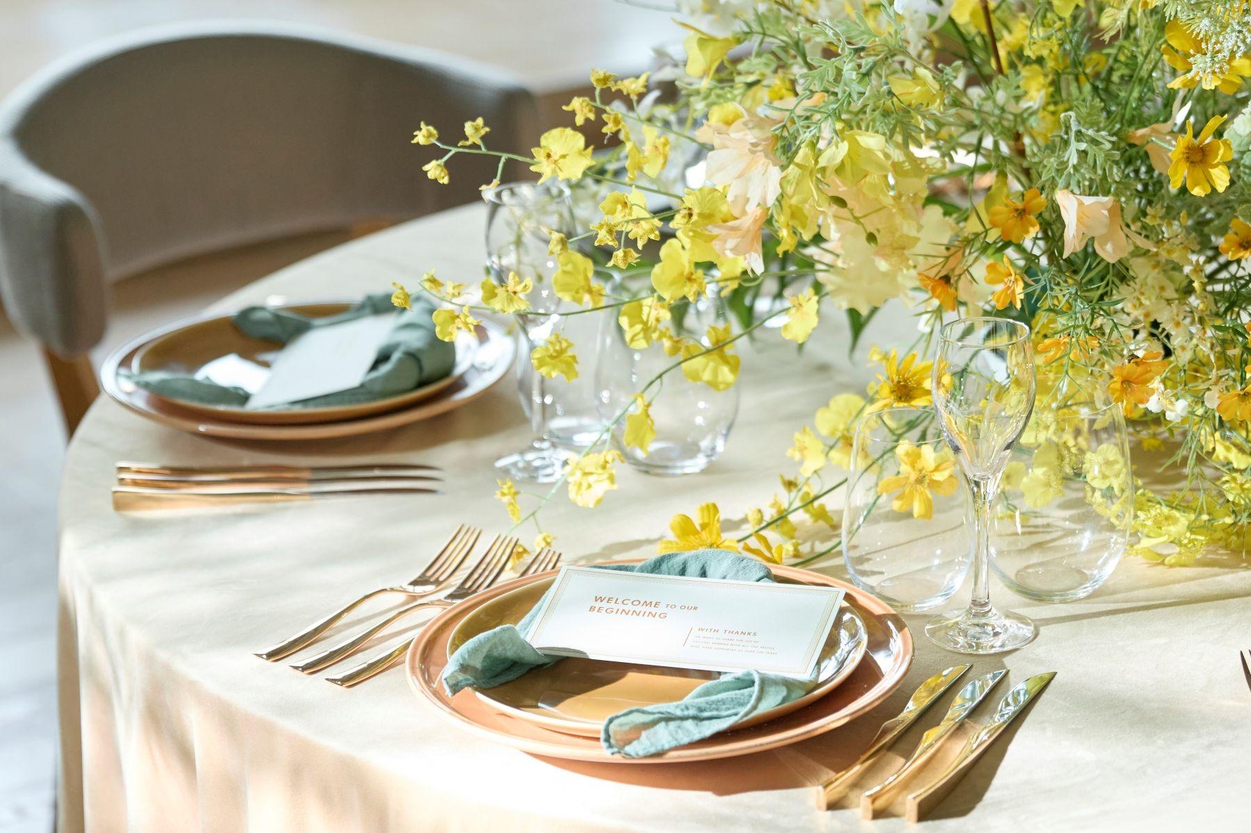 テーブルクロス・ナフキン・ペーパーアイテムに至るまで、豊富な種類からおふたりのテーマに合わせたコーディネイトが可能☆飾り付けのお花は、専属フローリストと相談できるからイメージも伝えやすくて安心◎