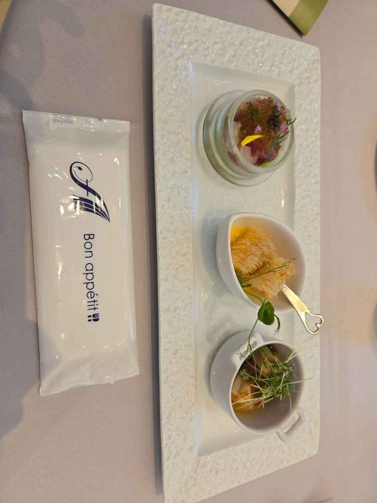前菜はどれも食べたことないような食事で美味しかったです。特にオマール海老の美味しさに私も彼も衝撃を受けました。 オープンキッチンの提供する台が熱くなっていていつでも出来たてを出せること、進み具合をみて調整してくれるところ、地場産へのこだわりをすごく感じました。