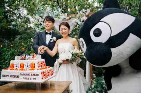 当日はふたりの大好きなもので飾り、大好きな人たちとグランパスくんに囲まれた一日になりました。ウェルカムビュッフェ、シュラスコ・デザートビュッフェ、ウェディングケーキにはグランパスファミリーと愛犬のマジパンを載せてもらい、大好きな苺ものせて仕上げてもらいました。ゲストの楽しそうな笑顔を見ることができて胸がいっぱいです。もう一回アージェントパルムで結婚式を挙げたいほど、大満足な一日となりました!