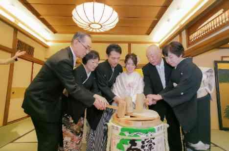 乾杯は縁起良く、大きな酒樽で鏡開き。