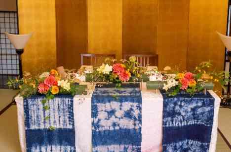 新婦様の地元の伝統工芸である、『有松絞り』 その美しい藍色をテーマカラーに、ペーパーアイテムや引き出物など、随所にコーディネートを施されました♪ 中でも特に好評だったのが、有松絞りのテーブルセンター。 サイズや数量の確保が難しい中ご準備されたそうですが、ゲストはもちろん、会場スタッフからも大変好評でした!