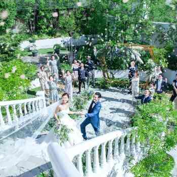 - 大階段で、祝福のフラワーシャワーを。白亜の邸宅をバックに、ガーデンウェルカムパーティーも楽しんで♪