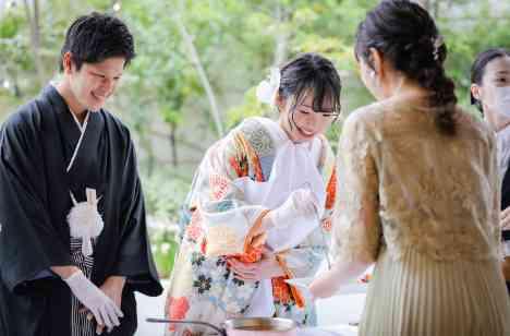 とにかく楽しんでもらえるような披露宴にしたいと思っていました。まず一品目のお料理でサプライズ(いたずら笑)を仕掛けて最初から楽しい空気に。私たちらしいクイズ(高級茶や新婦とプロの演奏を聞き分けてもらう)で格付けゲームをしたり、貸切のガーデンではBBQをしたり、ゲストに参加してもらえる時間たくさんつくり、とても楽しんでもらえました!