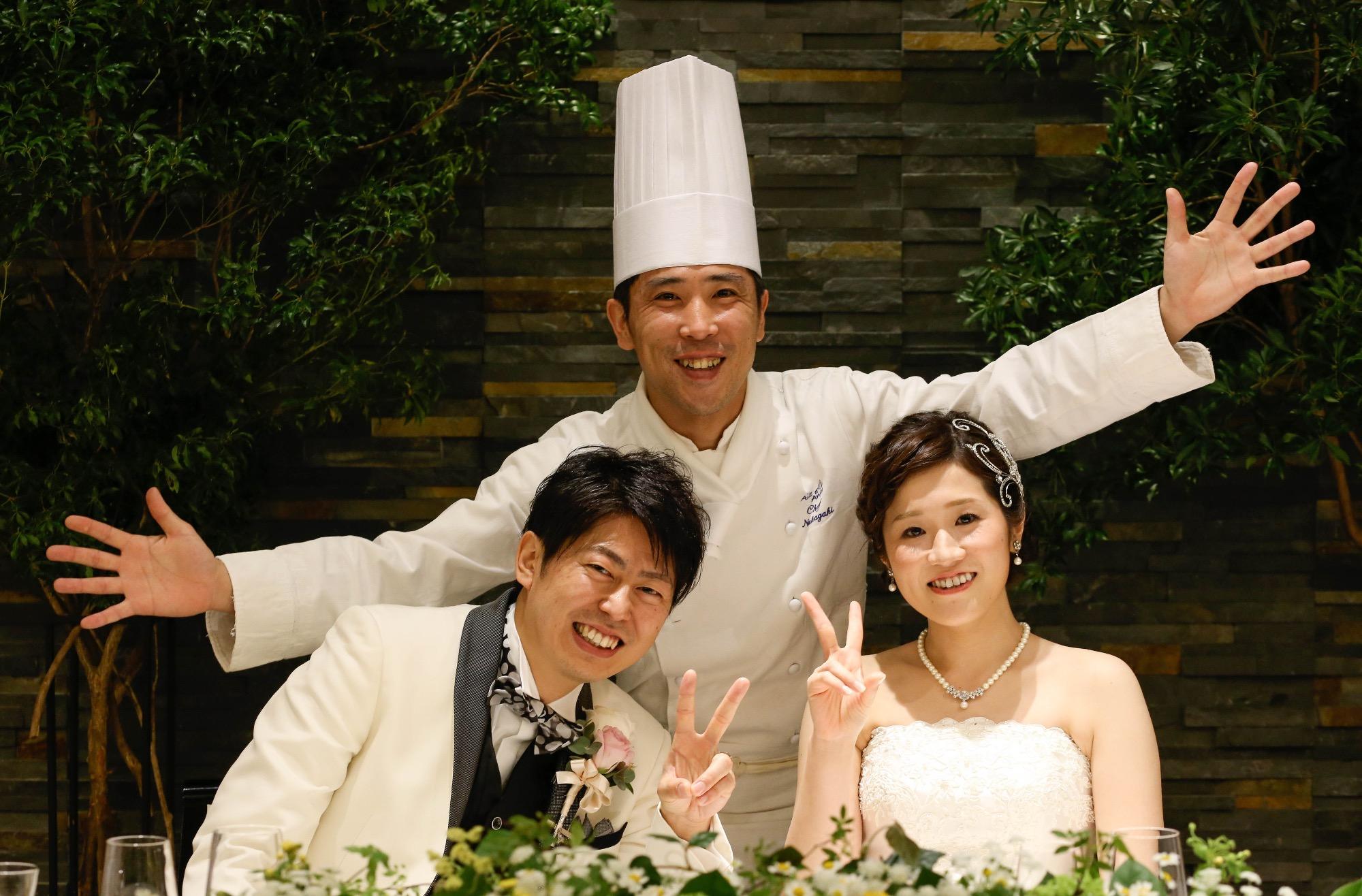 新郎様:お肉料理の岩塩 炎の演出 コックコートを着てゲストの前でフランベの 演出をしました。 新婦様:ガーデンでのお菓子まきをし、あたりをゲットした方へ お菓子リュックのプレゼントをしました。お菓子リュックを 背負ってもらう姿もとても可愛かったです