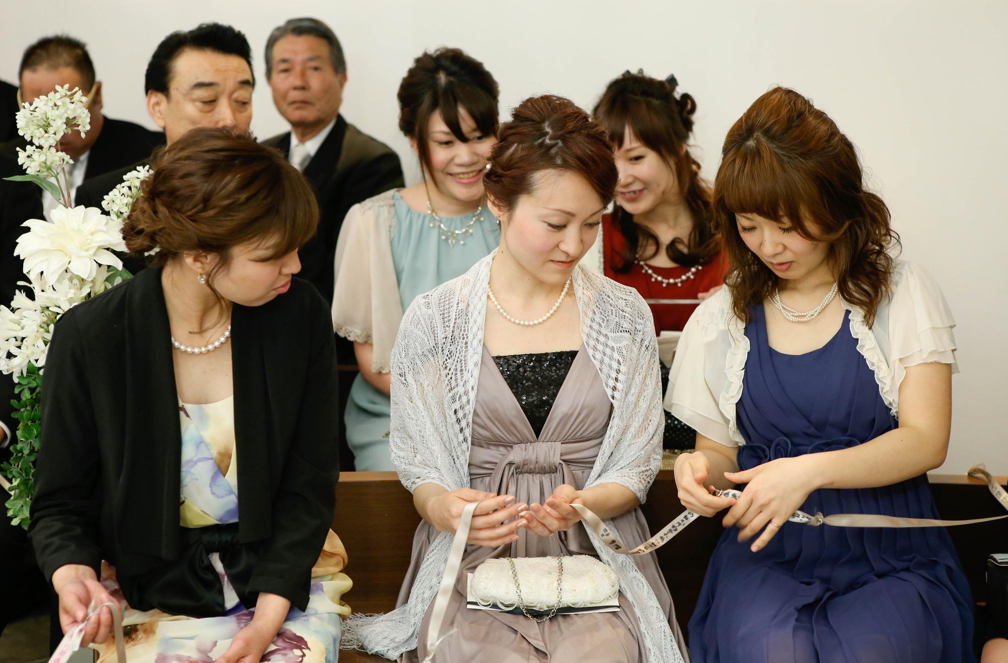 ゲストの皆さんと行った、リングリレーの演出は こだわりの一つです。 私たちの結婚指輪の「架け橋」を表現し、 リボンにはみなさんからメッセージを 書いていただきました。 リボンの色を選んだりとても素敵になりました。 挙式後のアフターセレモニーでは エルダンジュスタッフさんに ファンファーレを演奏してもらいました。
