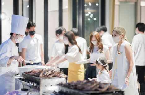 ガーデンにはBBQが登場!まるでホームパーティーに来たかのようにゲスト同士も距離が近く皆が自然体で楽しむ中、シェフが日常のようで日常ではない特別感を目の前で演出しおもてなしします。ゲスト全員の胸元にはお揃いのブートニアも。ドレスコードは白色・ラフ。あえて照明をおとした会場内にやわらかく灯る無数のライトは、ロマンチックでお洒落な雰囲気を演出。一体感のあるコーディネートや空間づくりにもこだわりました。