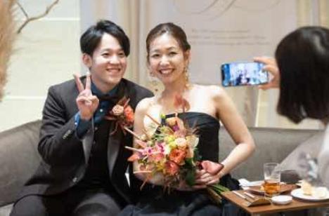 ドレス当てクイズのペンライトが灯る中、装い新たにおふたりが再入場。アイドルの明るくポップなラブソングをご新郎様が熱唱しながら練り歩き、会場は大盛り上がり! そして注目のドレスカラーはエッジの効いたブラック!ご新婦様のお好きなアイドルの推しカラーでもあり、『あなた以外には染まりません』という結婚式にもふさわしいモードなスタイルでゲストを魅了し惹きつけます。