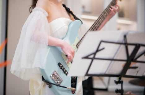 メインイベントの一つは生演奏!あくまで自然に音が会場内に溶け込むように。ゲストの皆様が写真を撮ったり、歓談をされているバックで、まずはピアノから音色を奏でます。サックスやご新婦様のベースも加わり、徐々に楽器が揃い華やかに。バンドメンバーの写真を撮るご新郎様、お席で音楽をじっくり楽しむご親族、音を感じながらお話を楽しむご友人。おふたりが思い描いていた皆んなが自然体で楽しく寛ぐひとときが実現しました。