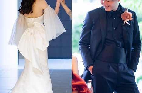素材の美しさを生かしたシンプルなウェディングドレス。後ろ姿はリボンの存在感が目を惹きます。甘くなり過ぎず洗練された大人っぽい印象になるアレンジにこだわった1着です。ポイントの袖はご新婦様のお持込み。軽やかで透け感のあるチュール素材がフェミニンさをプラスします。そしてタキシードもお持込みでオーダーメイド。再入場ではシャツをチェンジ。格をさらにあげるアクセントで、ワンランク上のお洒落さを演出します。