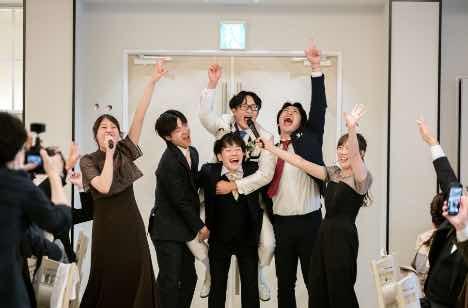 ご新婦様は中座のエスコートに妹様と弟様を選ばれました。その3人のお姿をカメラに収め微笑む親御様のお姿も印象的なシーン。ごきょうだいやご家族の温もりに会場が包まれる瞬間です。ご新郎様が選ばれたのは高校時代からのご友人グループ。3人でご新郎様を担ぎ、歌を歌いながら会場を盛り上げるご友人様たちの盛り上げに会場の皆んなも加わり、ご新郎様が願っていた「ばか楽しい!」雰囲気を皆んなで味わう事ができました。