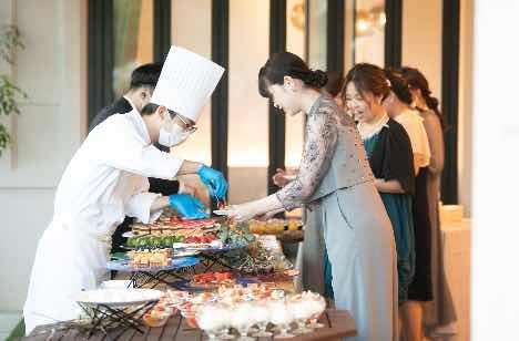 ガーデンには色とりどりのデザートが並び、パティシエがお一人おひとりにおもてなし!心地の良い空気や自然光を感じながら、皆んなが思い思いにデザートを楽しむ開放的で自由なひとときが流れます。味はもちろん見た目でも楽しいわくわくするデザートビュッフェ♪皆んなが自然体になれる演出だからこそ 最後の歓談・お写真タイムでは、皆様のとびきり楽しい笑顔が溢れました。