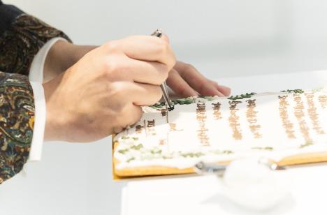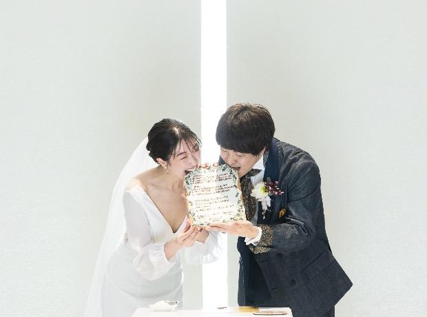 実は食べることが大好きなお二人。色々なところへ旅行に行って美味しいものを食べることが大切な想い出。誓いの言葉はそんなお二人らしくアイシングクッキーで作りました。そこにチョコペンでご署名をすれば結婚証明書の完成です。「お二人の誓いを永遠のものにしていただきましょう」という司会者のアナウンスで同時にバイト!わ〜!かわいい〜!とチャペルには歓声が溢れます。また1つ食にまつわる大切な想い出ができました。